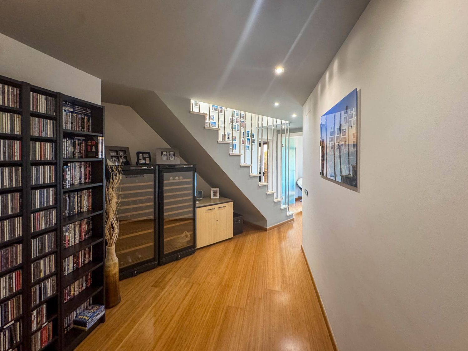 Im Inneren erwarten Sie ein großzügiger Wohnraum mit Marmorboden, Kamin und Zugang zur Terrasse, ein elegantes Esszimmer und eine moderne Santos-Küche mit deutschen Qualitätsgeräten, Silestone-Arbeitsflächen und Frühstücksbar aus Holz. Ein Arbeitszimmer und ein Gäste-WC ergänzen die Ebene.