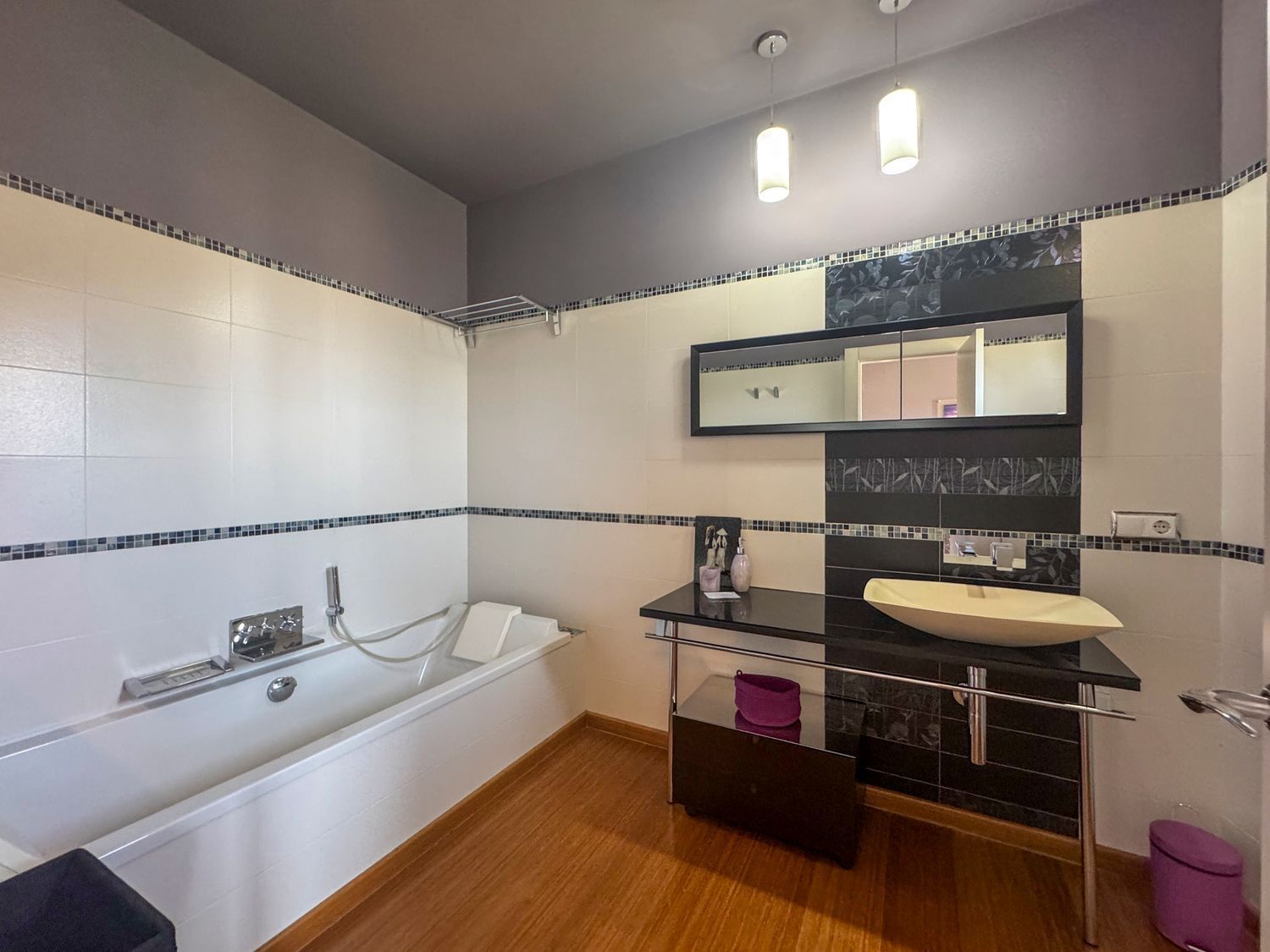 Das Hauptschlafzimmer im Obergeschoss verfügt über Bambusboden, eine gewölbte Decke und eine private Terrasse. Das luxuriöse Badezimmer bietet Doppelwaschbecken, freistehende Badewanne und begehbare Dusche.