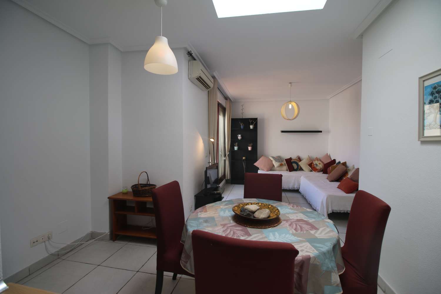 Al entrar, encontramos un salón comedor luminoso, decorado con un estilo mediterráneo acogedor y acceso directo a una de las terrazas. La cocina, abierta al salón, está completamente equipada y cuenta con lavadero independiente, aportando funcionalidad y espacio de almacenaje adicional.
