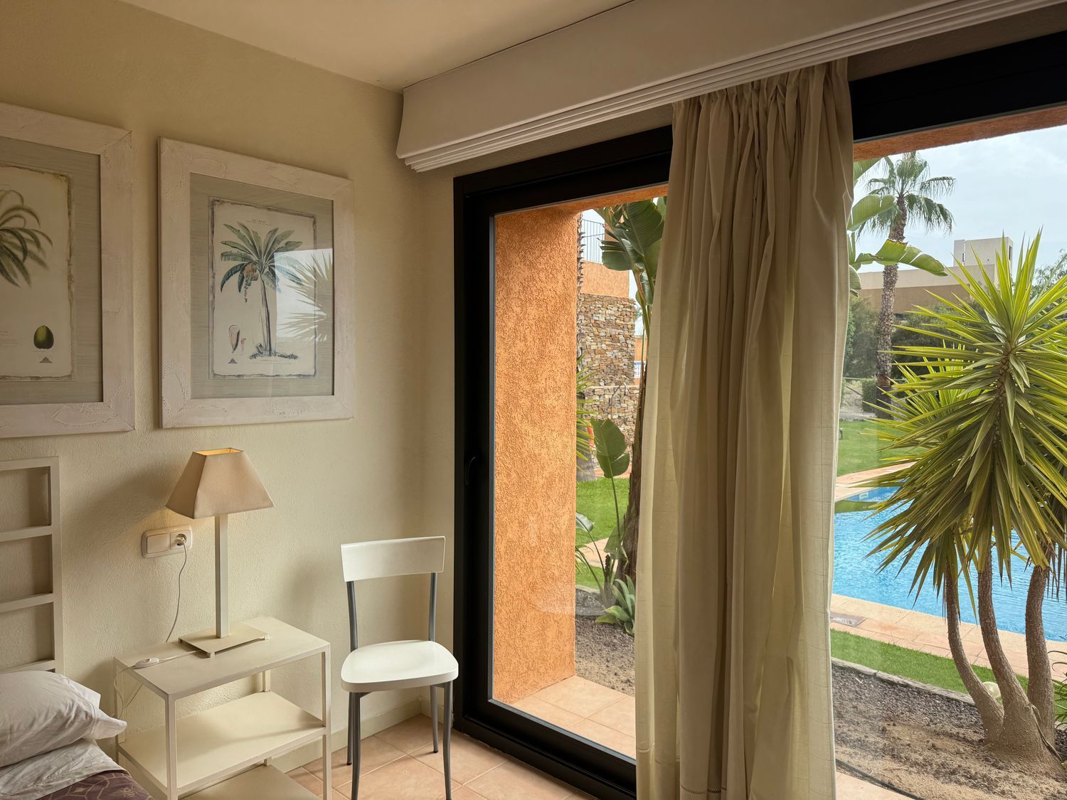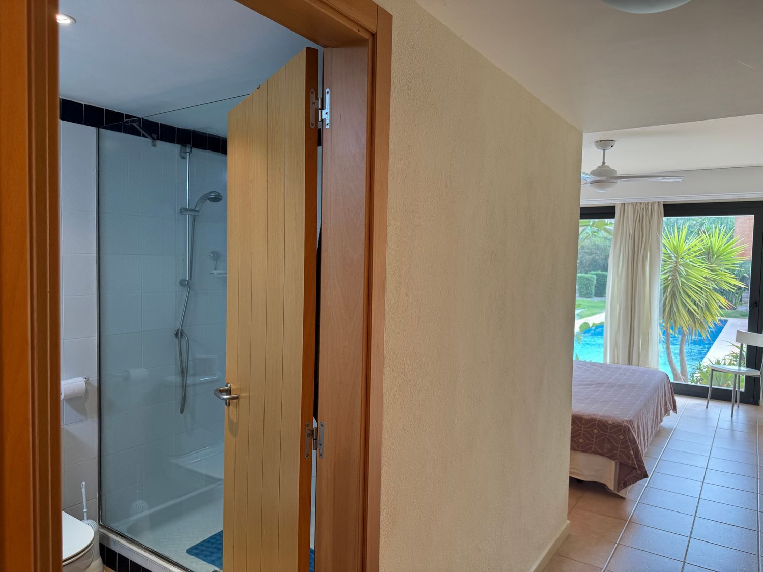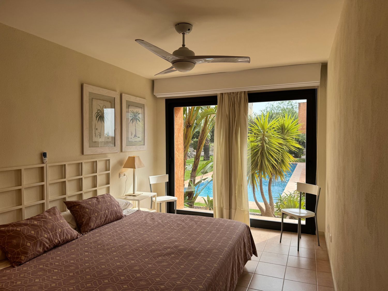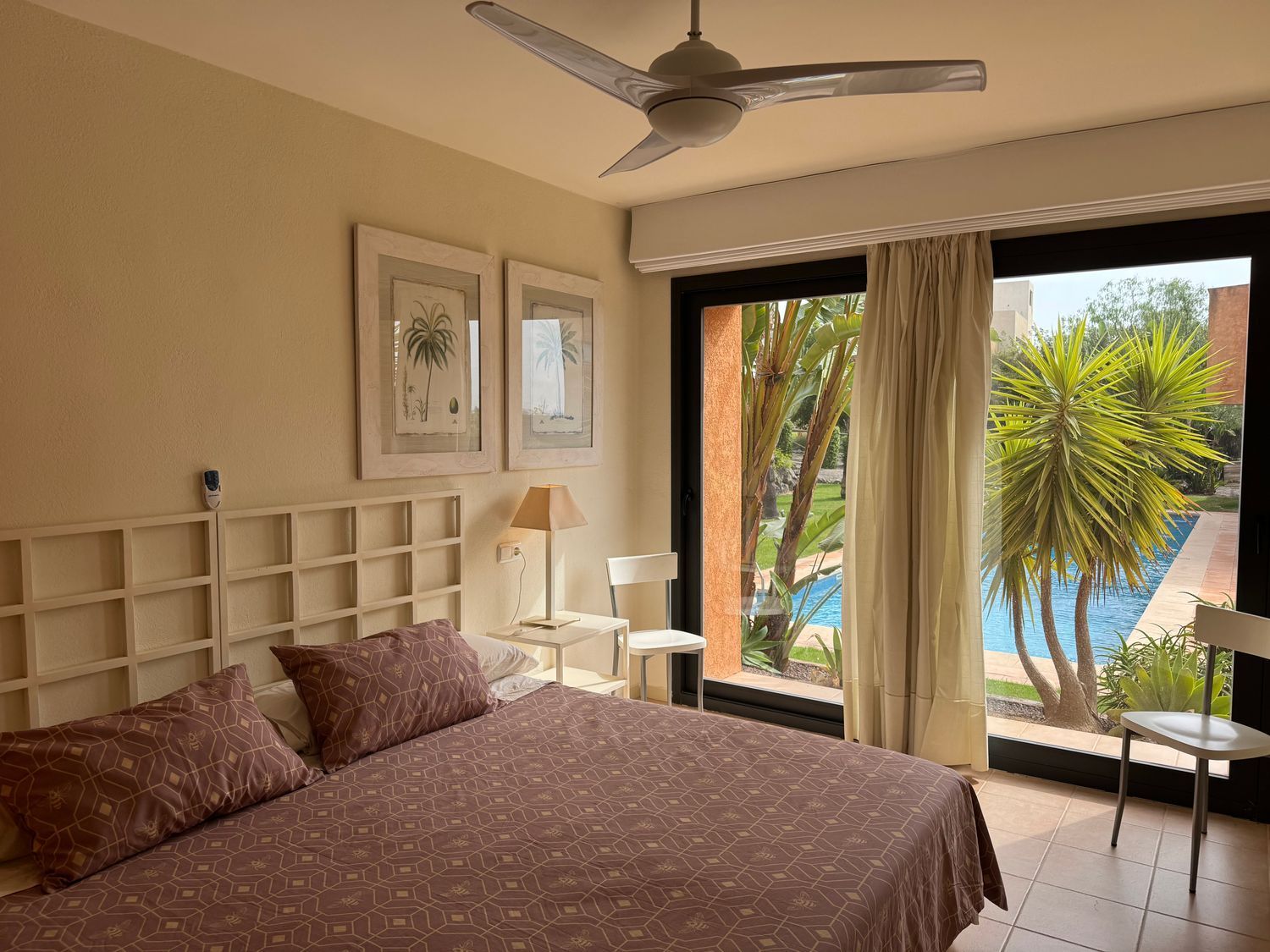 El dormitorio principal destaca por su acceso directo a la piscina, armarios empotrados y ventilador de techo, además de contar con un baño en suite que proporciona privacidad y confort. El segundo dormitorio dispone de su propia terraza privada, mientras que el tercer dormitorio, individual, también cuenta con salida exterior, lo que garantiza luz natural en todos los espacios. Un segundo baño con ducha a ras de suelo da servicio a las demás estancias.