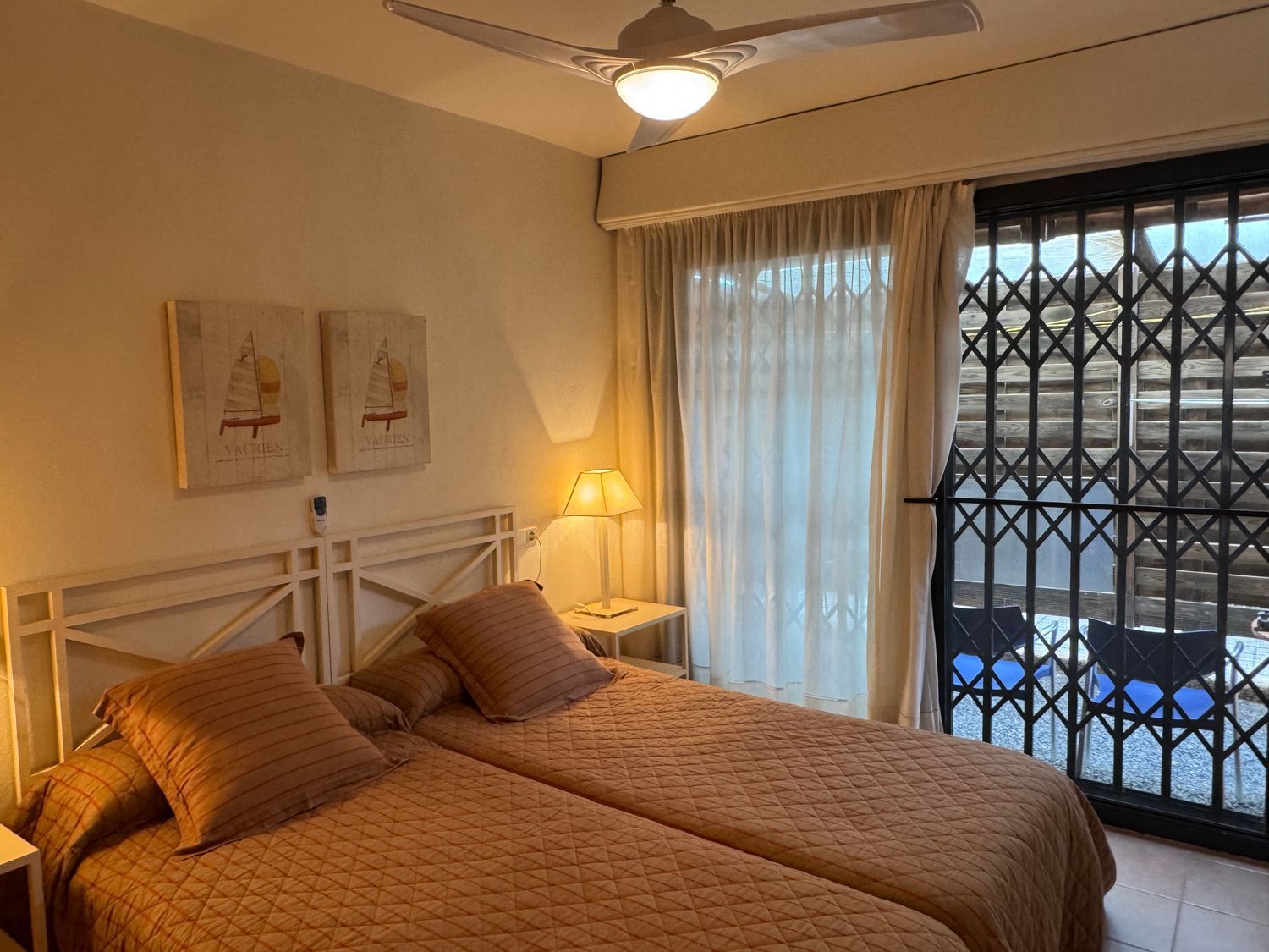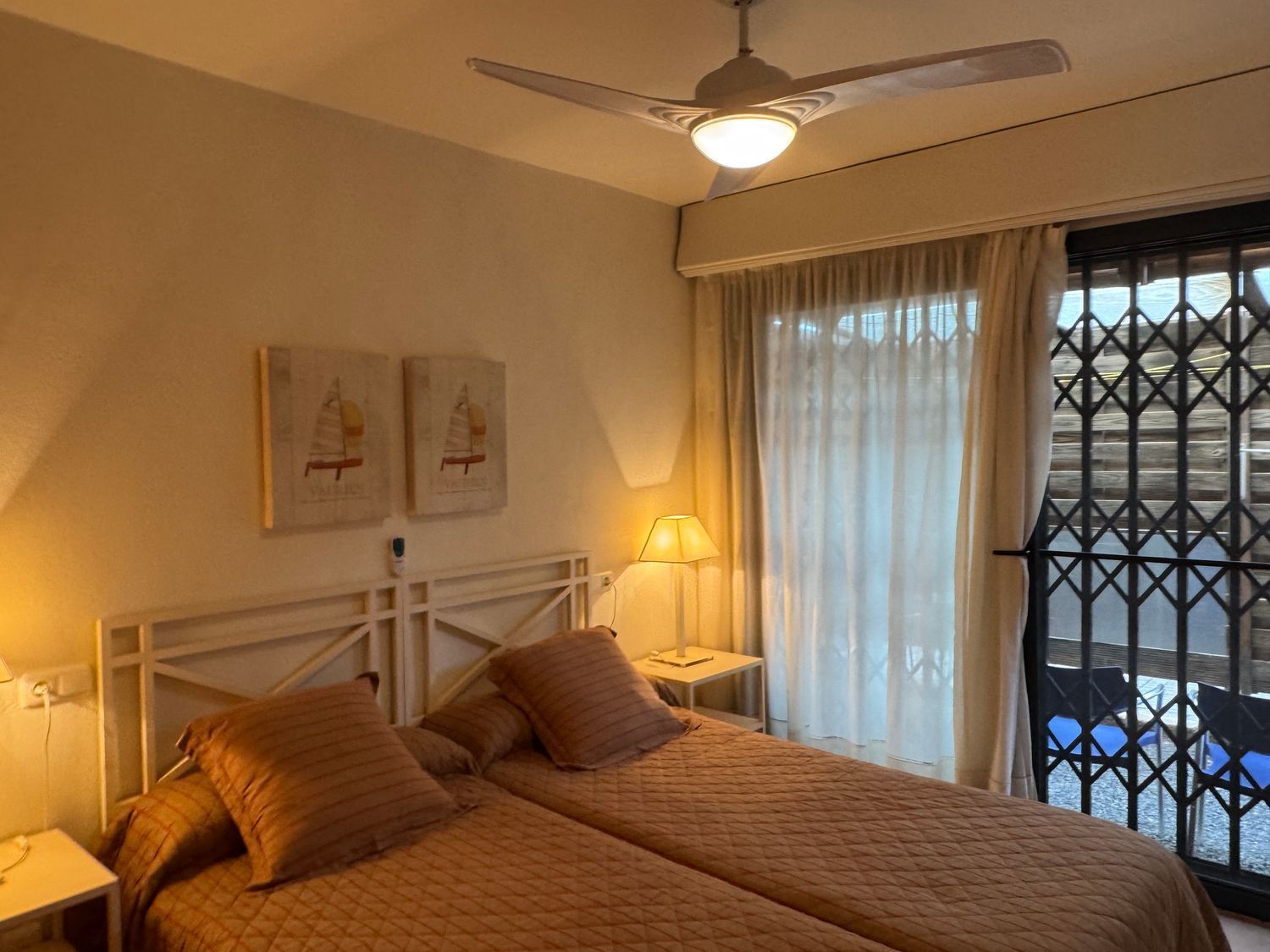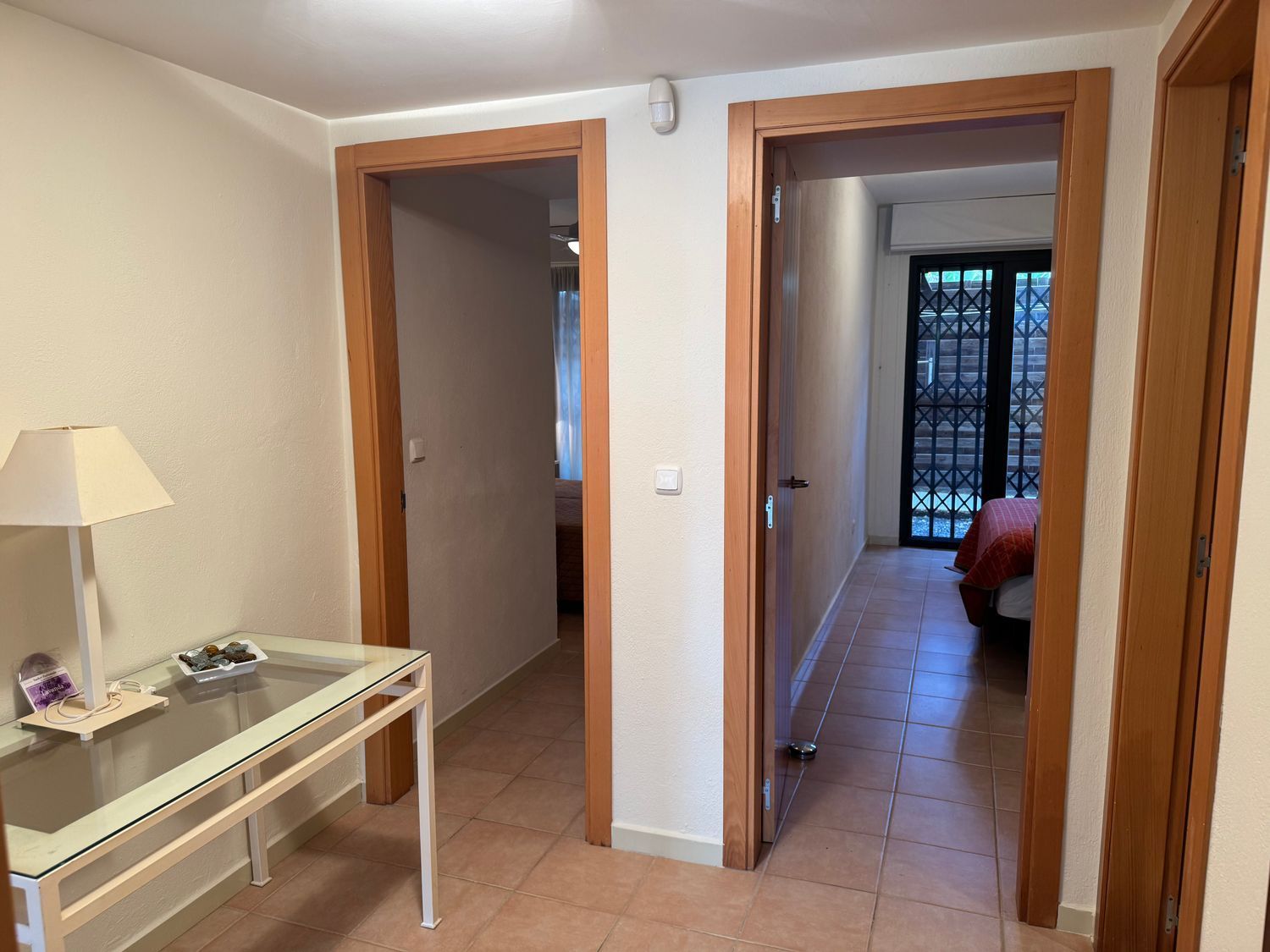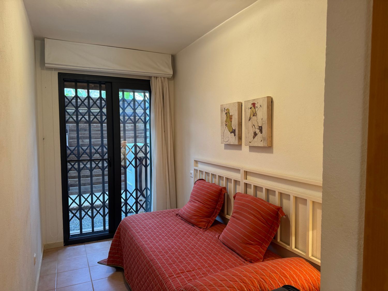 El dormitorio principal destaca por su acceso directo a la piscina, armarios empotrados y ventilador de techo, además de contar con un baño en suite que proporciona privacidad y confort. El segundo dormitorio dispone de su propia terraza privada, mientras que el tercer dormitorio, individual, también cuenta con salida exterior, lo que garantiza luz natural en todos los espacios. Un segundo baño con ducha a ras de suelo da servicio a las demás estancias.