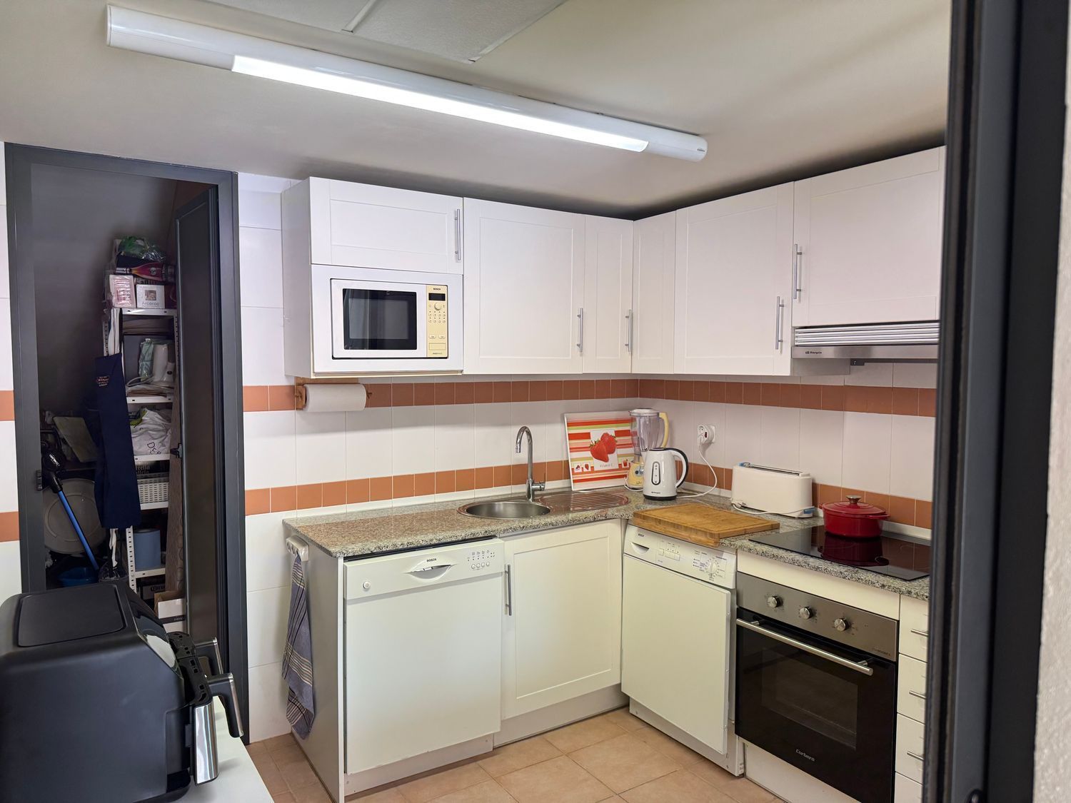 La cocina moderna, completamente renovada y equipada con electrodomésticos nuevos, ofrece funcionalidad y elegancia. Su diseño abierto facilita la interacción con el comedor y la zona social.