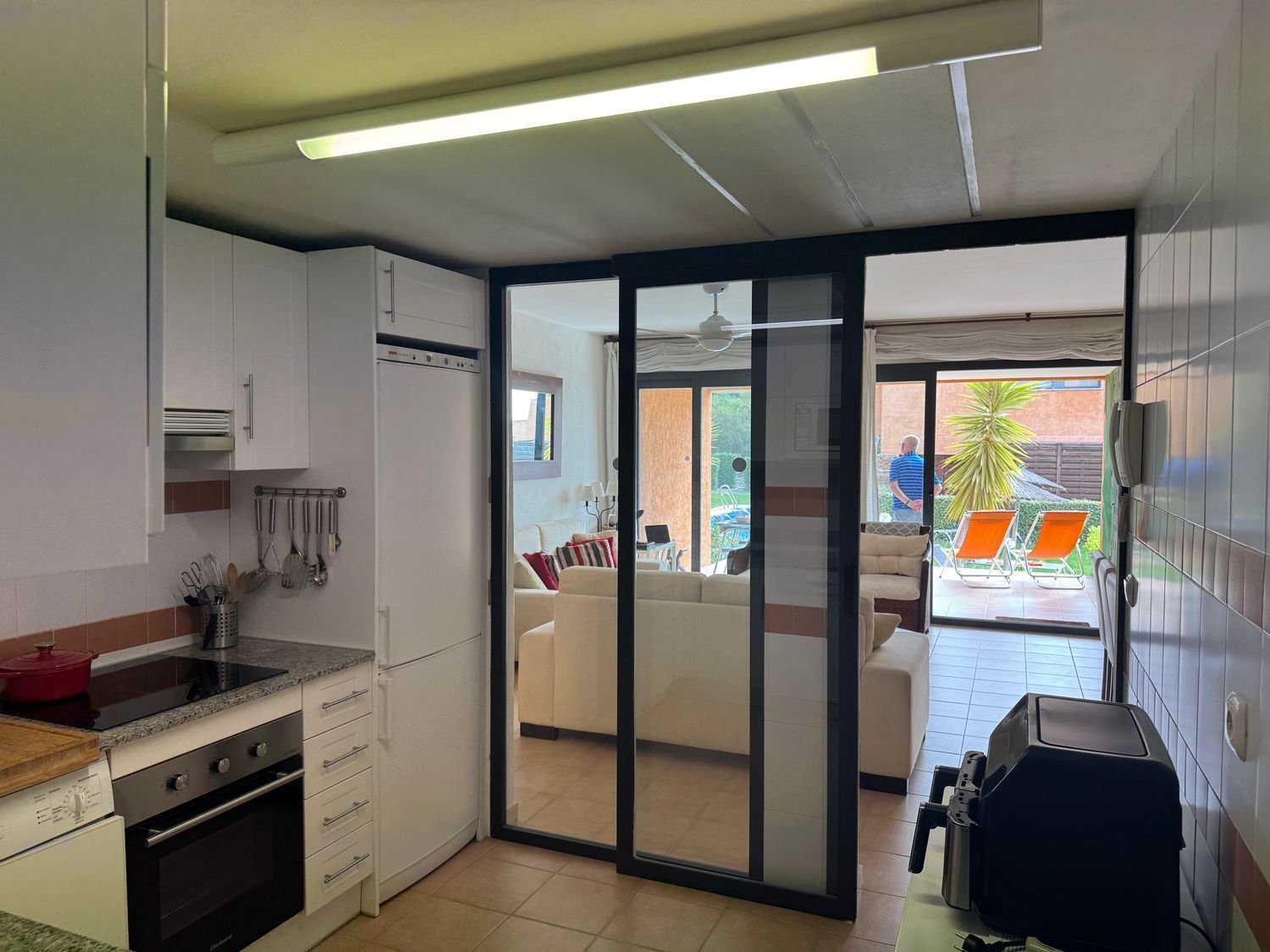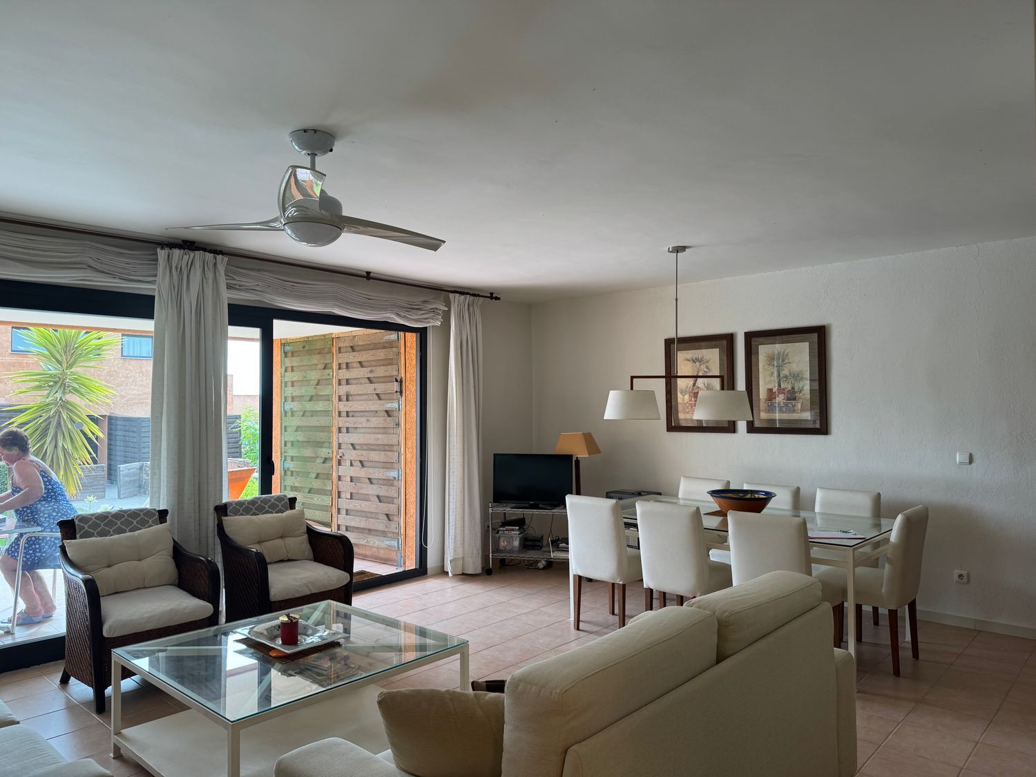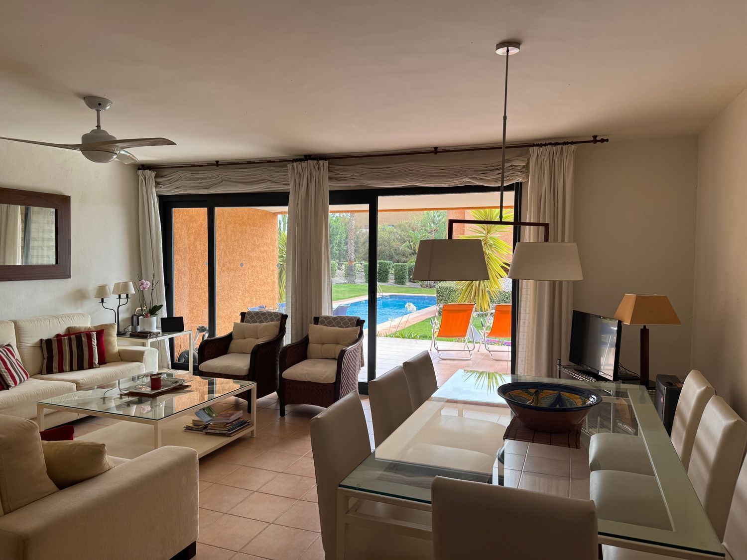 Al acceder a la propiedad, se descubre un gran salón-comedor con amplios ventanales y puertas correderas que se abren directamente a una terraza privada, desde la cual se accede a la zona de piscina. Este espacio exterior, perfecto para desayunos al sol o cenas al atardecer, representa la esencia del estilo de vida relajado del sureste español.